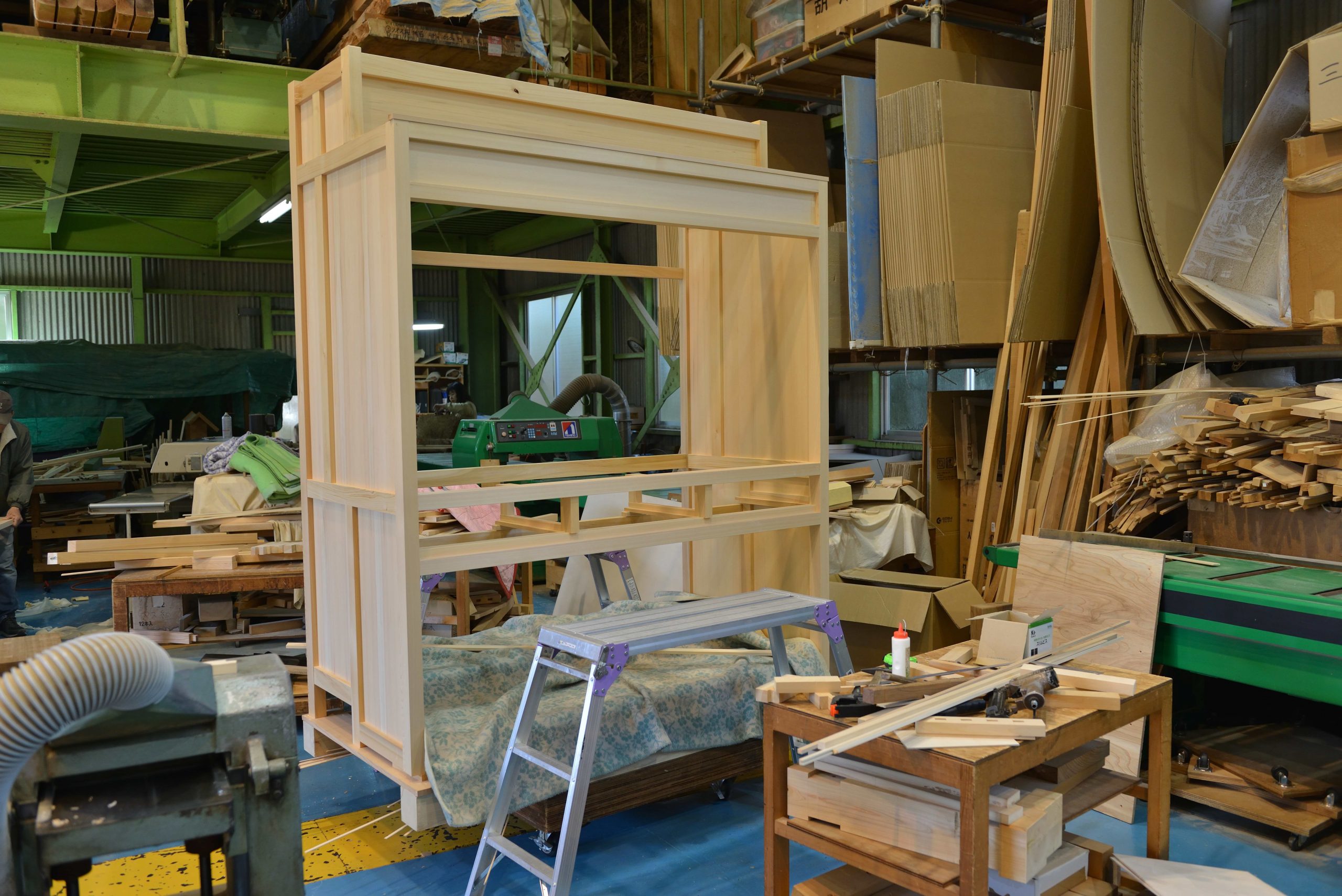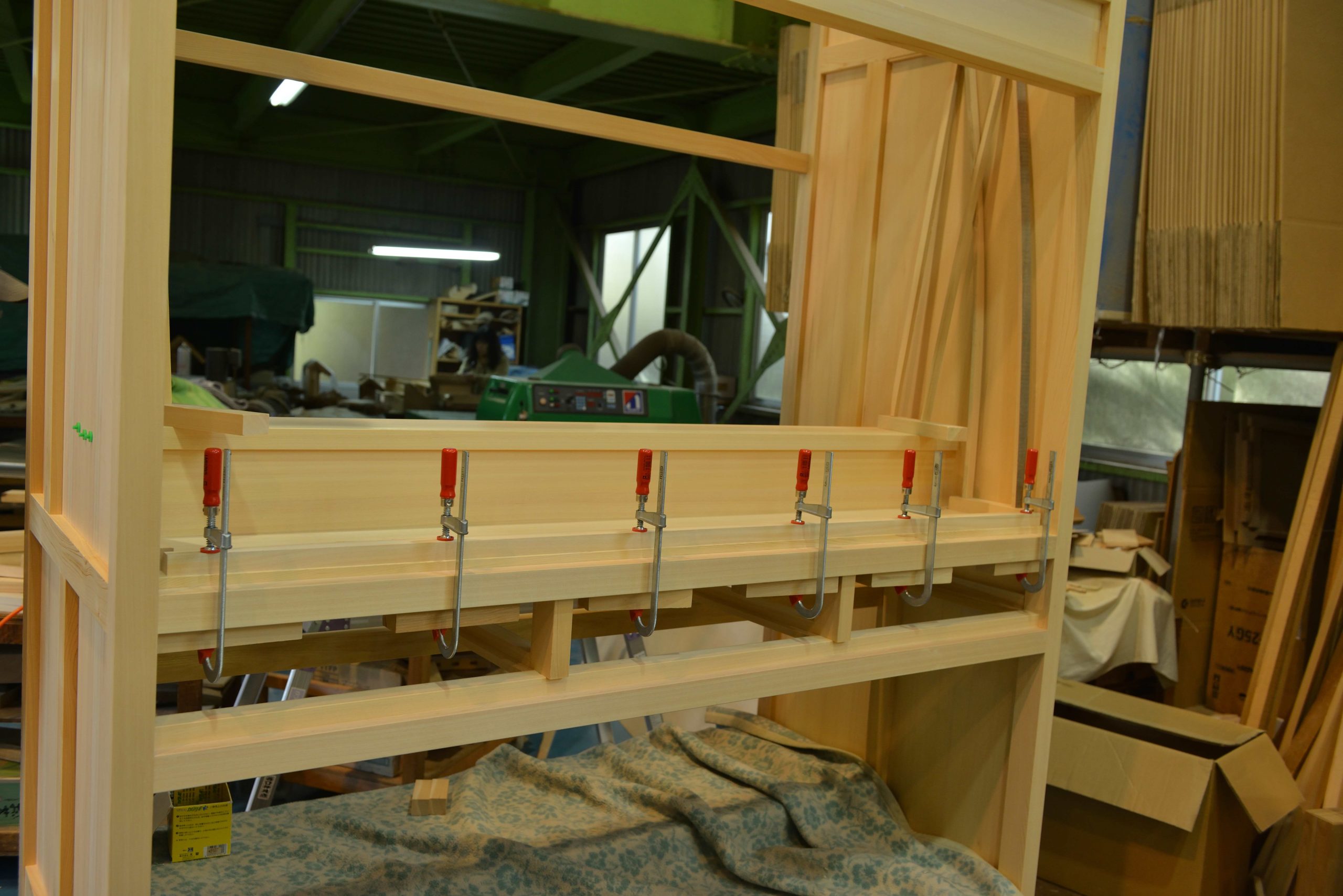 御霊舎の正面枠組みを現場のスペースにきっちりとはめ込んで収まることを確認してから箱に組み上げます。