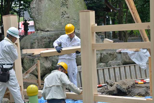 控柱をつなぐ3本の貫を入れるだけでも3人がかりの大仕事