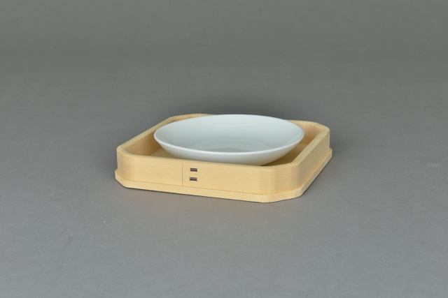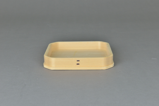 折敷「おしき」は神饌を供える時に用いる台で、三宝の袴部分がなく、繰形もありません。略式の神撰や御新酒など背が高いものを献饌する際に使われます。材質は木曽桧柾目板を使用しています。