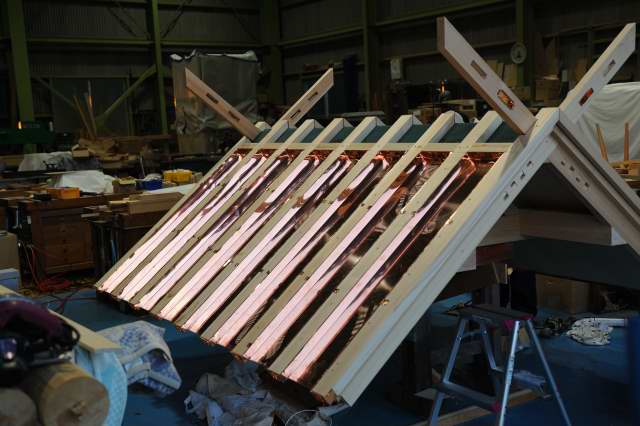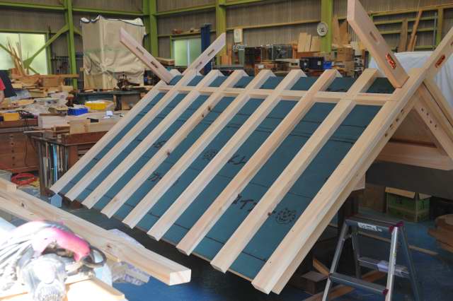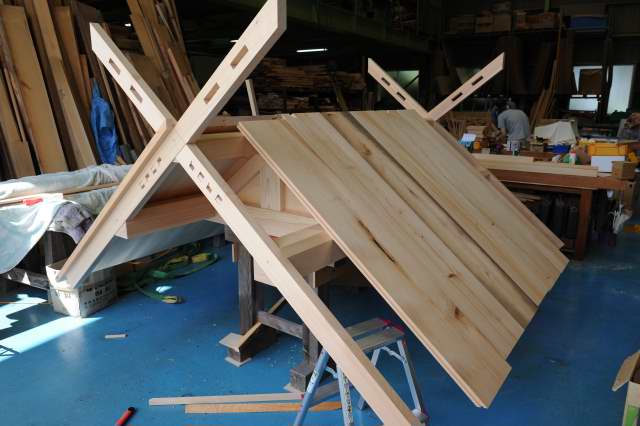 屋根の組立、伊勢神明造の屋根の千木は破風が延長した物で一体の構造になっています。屋根板は銅板葺をするので下面が綺麗な板で葺いてゆきます。